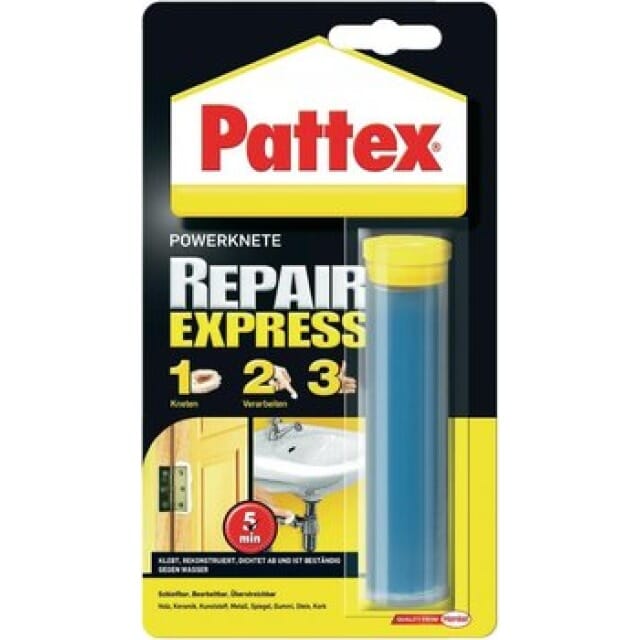 Pattex Repair Express Powerknete ist eine schnell härtende 2-Komponenten-Knetmasse. Manche Dinge können nicht warten. Pattex Repair Express Powerknete bietet schnelle und starke Verbindungen. Mit diesem Produkt können Sie reparieren, ausbessern und verschiedene Materialien zusammenkleben, z. B. Holz auf Plastik oder Metall. Pattex Repair Express Powerknete kann auch auf feuchten Oberflächen verwendet werden, ist überstreichbar und kann geschliffen und bearbeitet werden. Für drinnen und draußen.