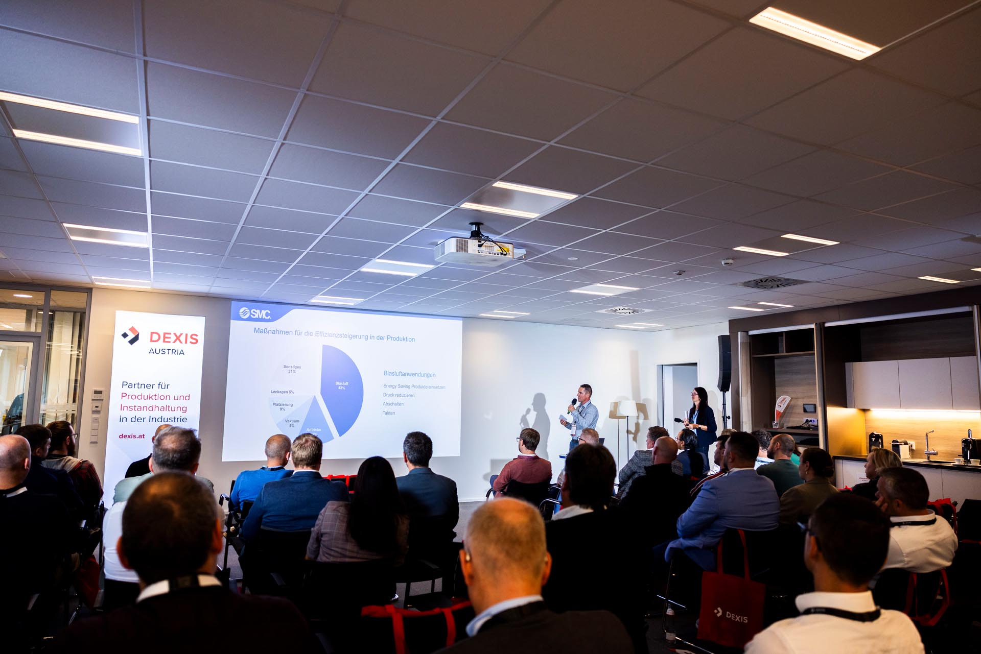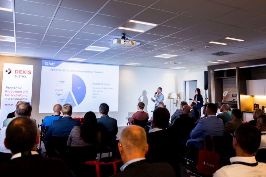 Bettina Dickinger und Berthold Kösseldorfer von SMC gaben einen spannenden Einblick in die Optimierung von Druckluftsystemen sowohl bei bestehenden als auch zukünftigen Maschinen und Anlagen. SMC zeigte auf, wie das Unternehmen bereits seit vielen Jahren die Industrie mit innovativen Produkten und maßgeschneiderten Lösungen unterstützt, um die Effektivität und Effizienz in der Produktion nachhaltig zu steigern.