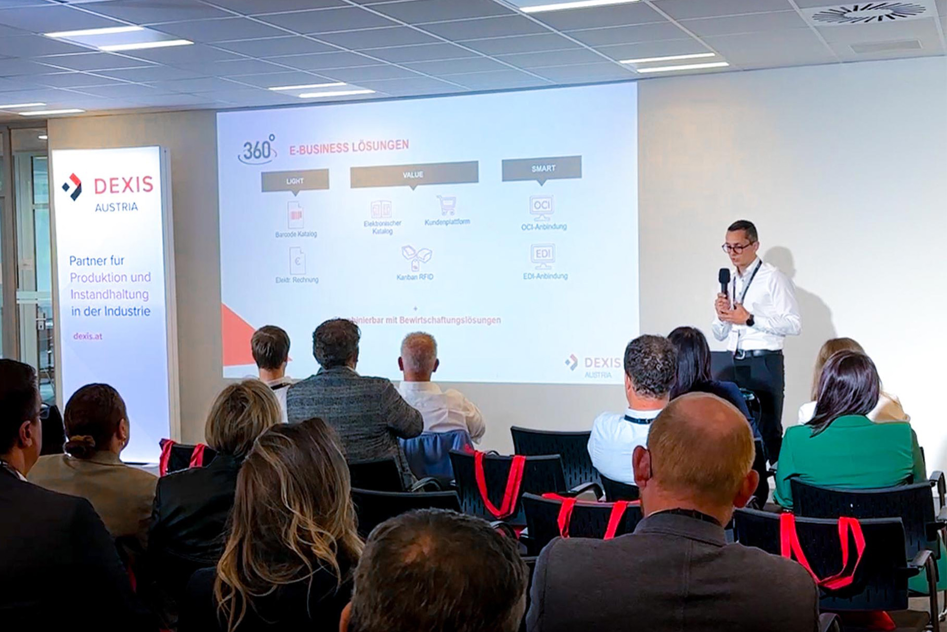 Peter Aichinger von DEXIS Austria gab in seinem Vortrag einen umfassenden Einblick in die E-Business Lösungen von DEXIS und zeigte, wie Digitalisierung konkret zur Effizienzsteigerung und Kostensenkung im Beschaffungsprozess beitragen kann.